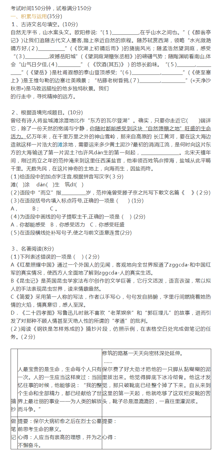 2021年江苏省盐城市初中毕业学业水平考试语文试卷