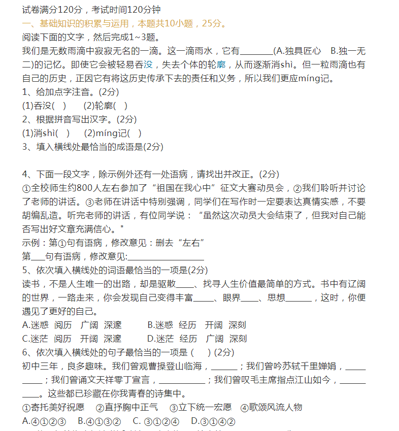 2022年贵州遵义初中毕业学业水平考试语文试卷