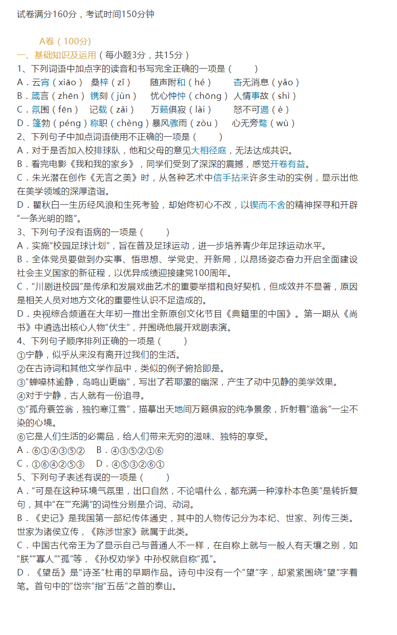时间:150分钟 / 总分:160分 | 2022-04-15 08:38:07