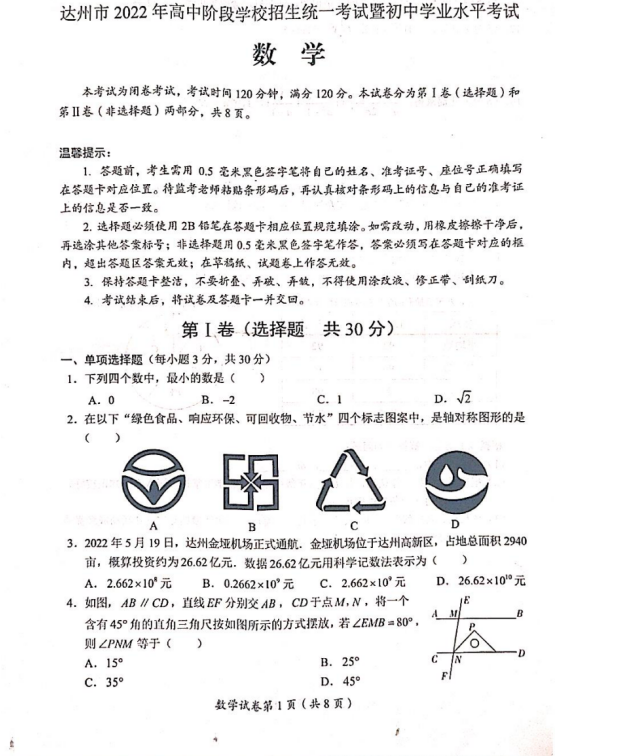 2022年四川达州初中毕业生学业水平考试数学试卷