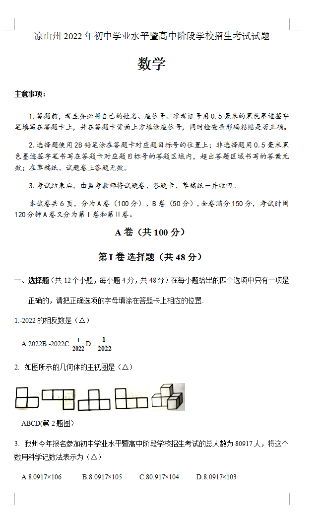 2022年四川凉山初中毕业生学业水平考试数学试卷