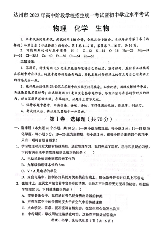 2022年四川达州初中毕业生学业考试物理试卷