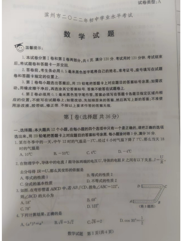 2022年山东滨州初中毕业生学业水平考试数学试卷