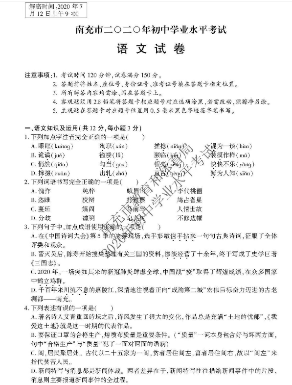 2022年贵州遵义初中毕业学业水平考试语文试卷