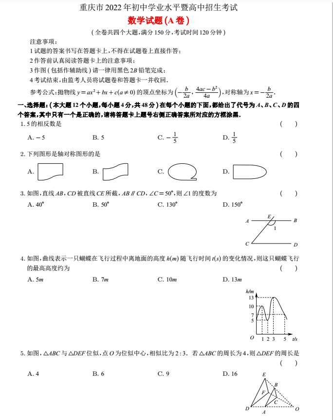2022年重庆市初中毕业生学业水平考试数学试卷A卷