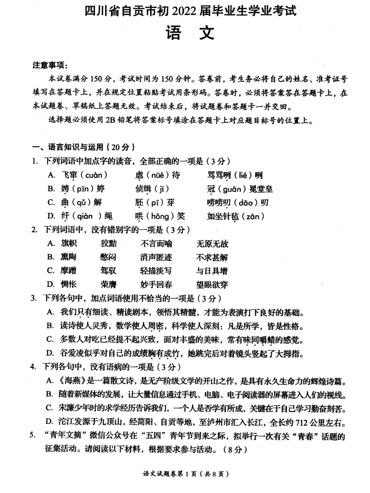 2022年四川自贡初中毕业学业水平考试语文试卷