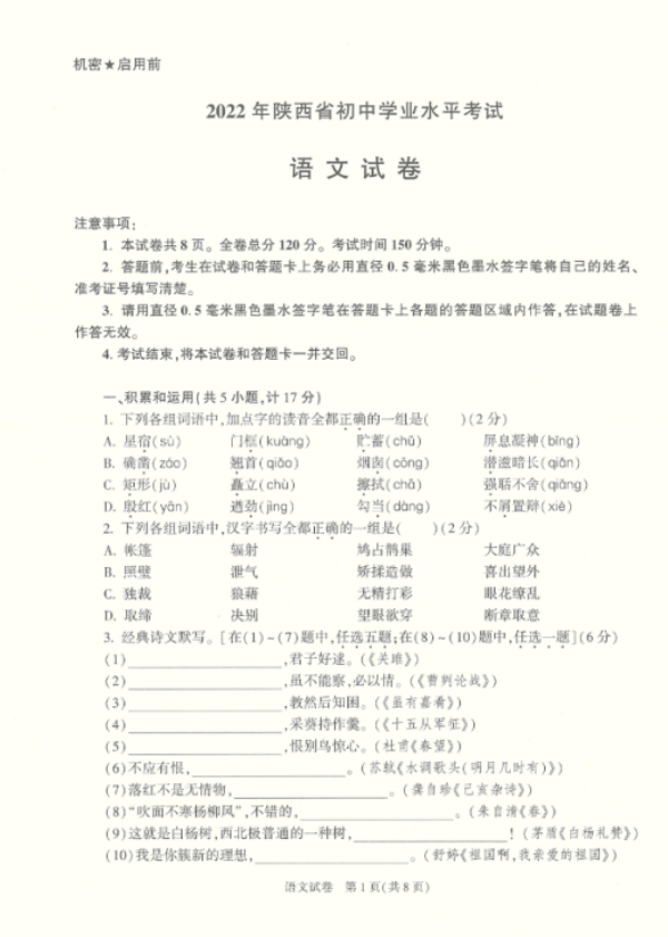 2022年陕西省初中毕业学业水平考试语文试卷