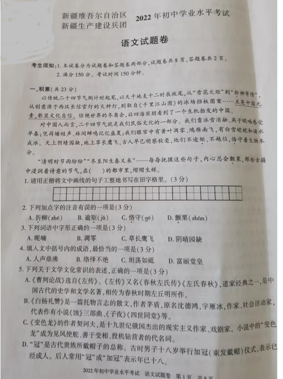 2022年新疆初中毕业学业水平考试语文试卷