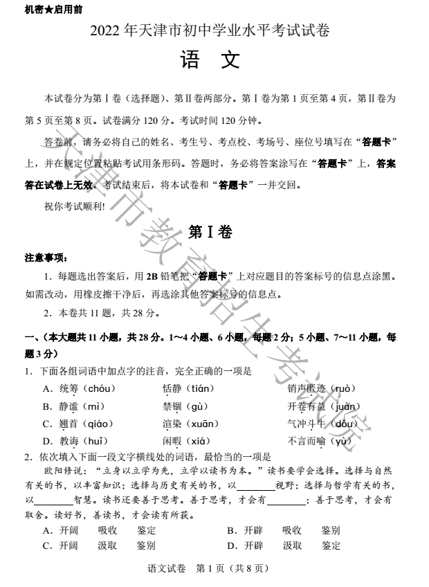 2022年贵州遵义初中毕业学业水平考试语文试卷