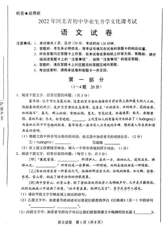 2022年贵州安顺初中毕业学业水平考试语文试卷