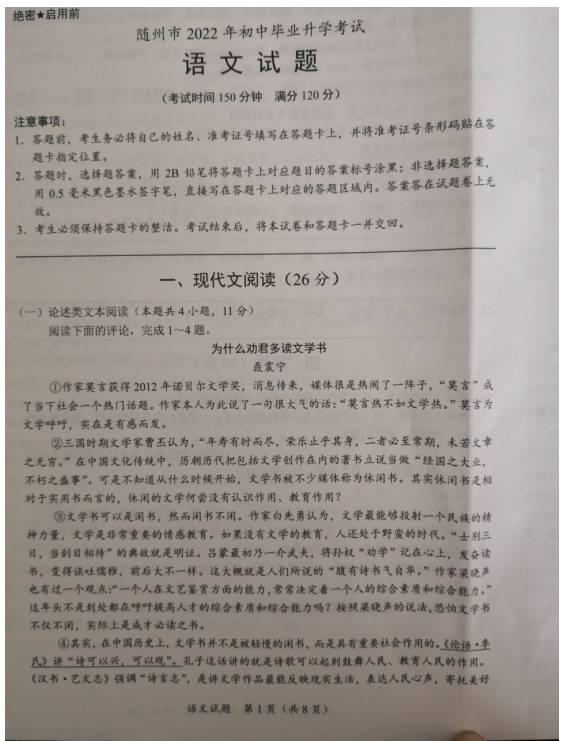 2022年湖北随州初中毕业学业水平考试语文试卷