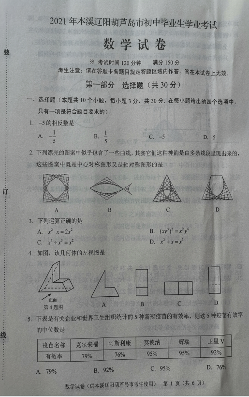 2021年辽宁本溪市初中学业水平考试数学试卷