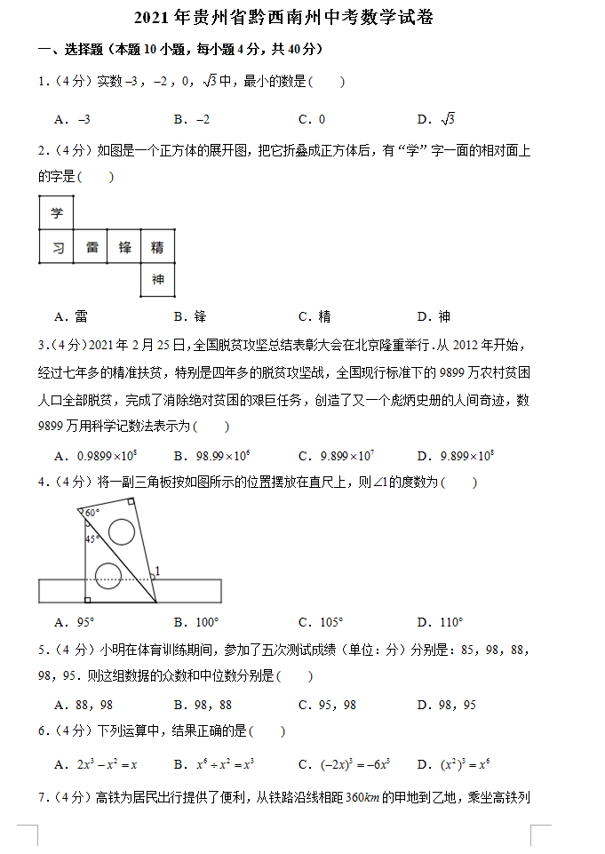 2021年贵州黔西南州初中毕业生学业水平考试数学试卷