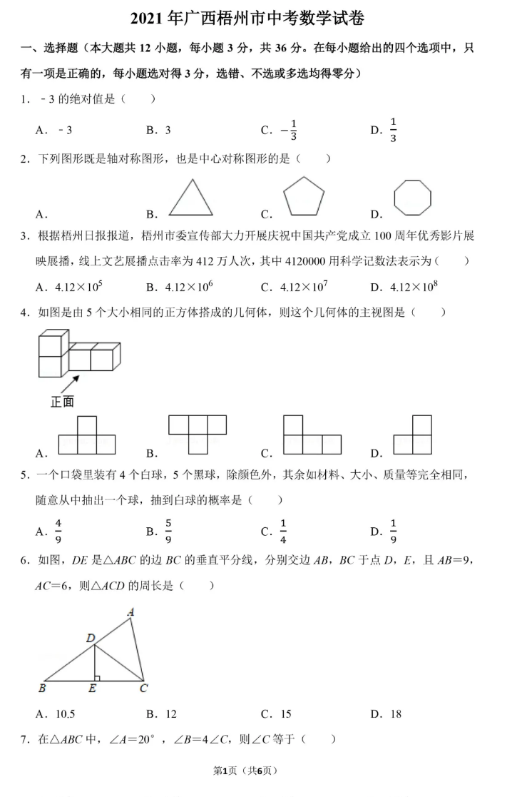 2021年广西梧州市初中毕业生学业水平考试数学试卷