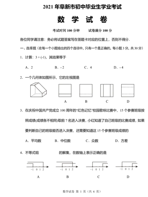 2021年辽宁阜新市初中毕业生学业水平考试数学试卷