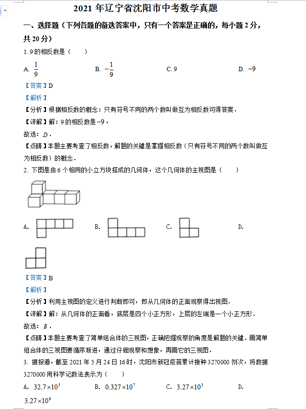 2021年辽宁沈阳市初中毕业生学业水平考试数学试卷