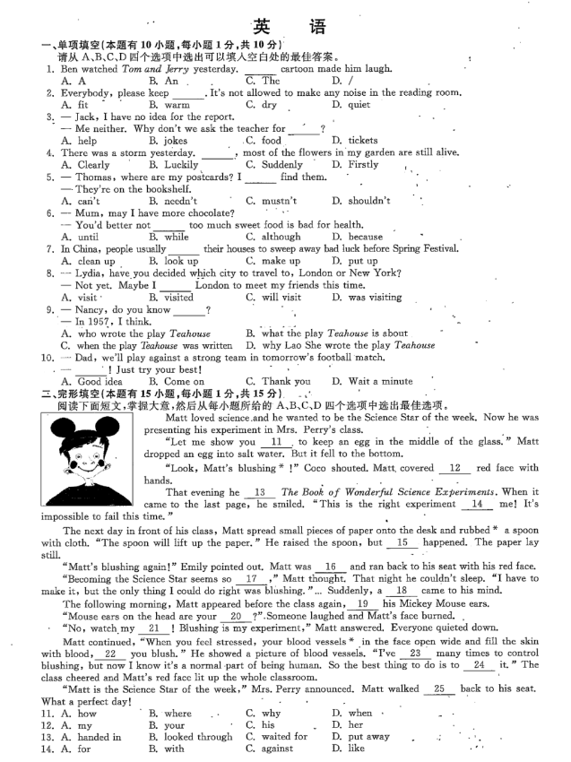 2022年上海市初中学业水平考试英语试卷