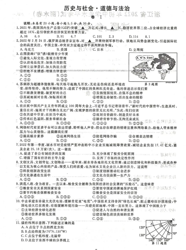 2022年浙江省丽水市初中学业水平考试历史真题试卷