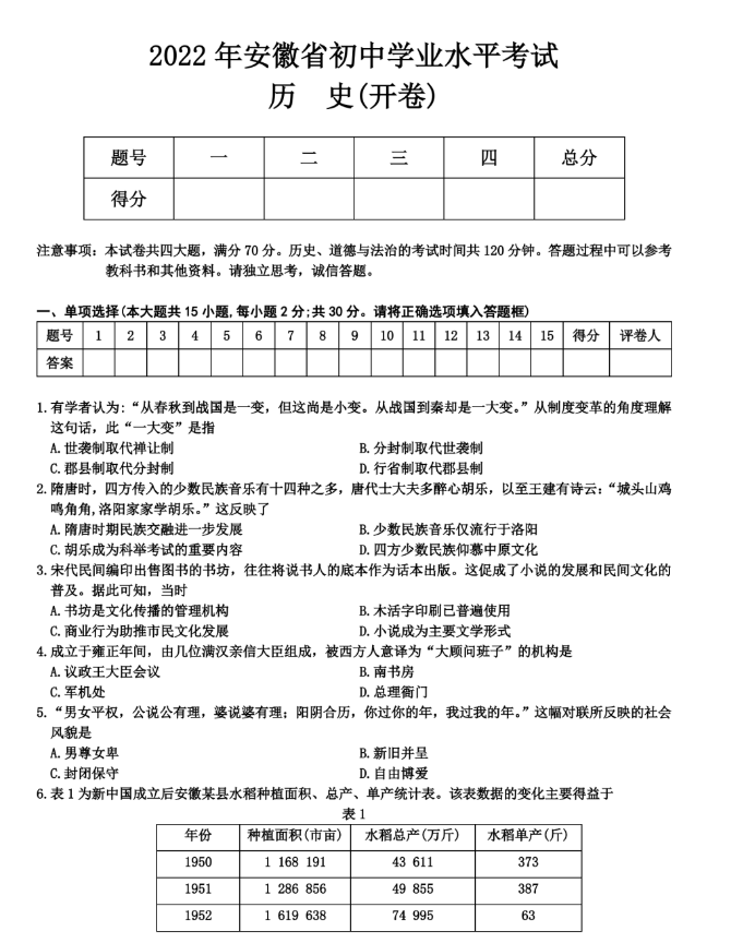 2022年湖南岳阳市初中学业水平考试历史真题试卷