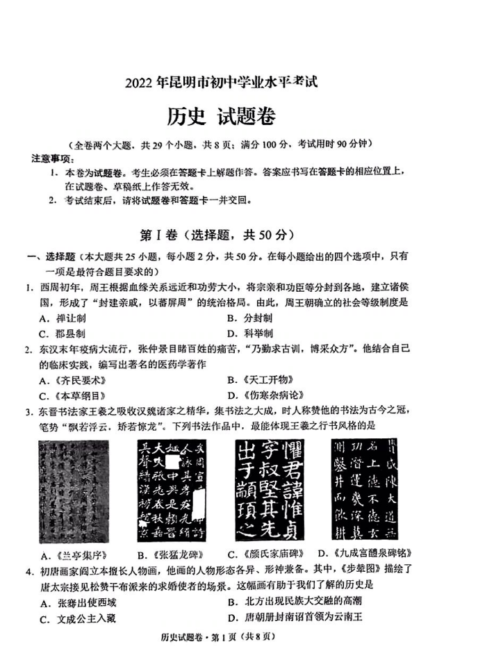 2022年云南省昆明市初中学业水平考试历史真题试卷