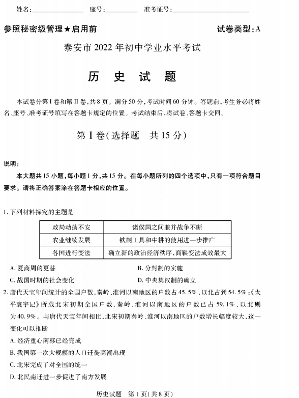 2022年山东省泰安市初中学业水平考试历史真题试卷