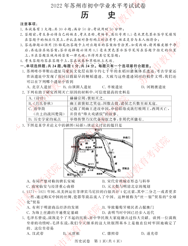 2022年江苏省苏州市初中学业水平考试历史真题试卷