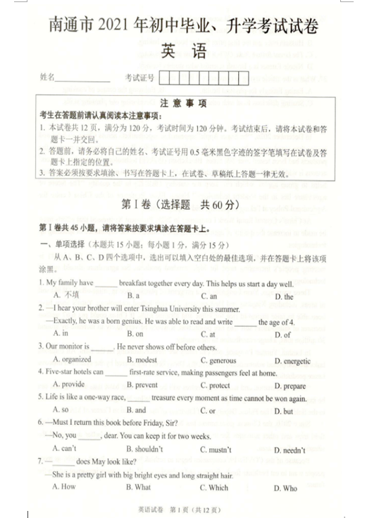 上一篇:2021年江苏泰州市初中学业水平考试英语真题