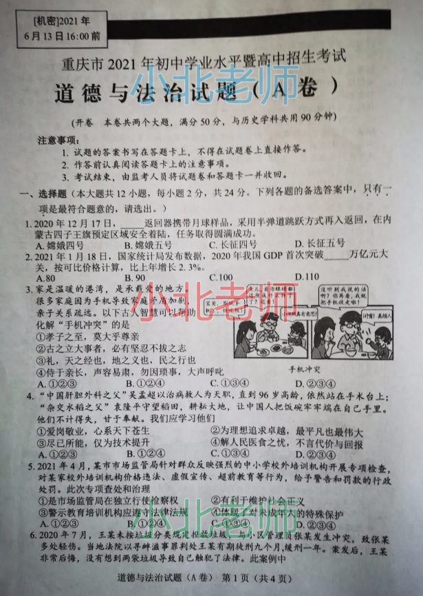 2021年重庆市毕业生学业考试道德与法治真题A卷