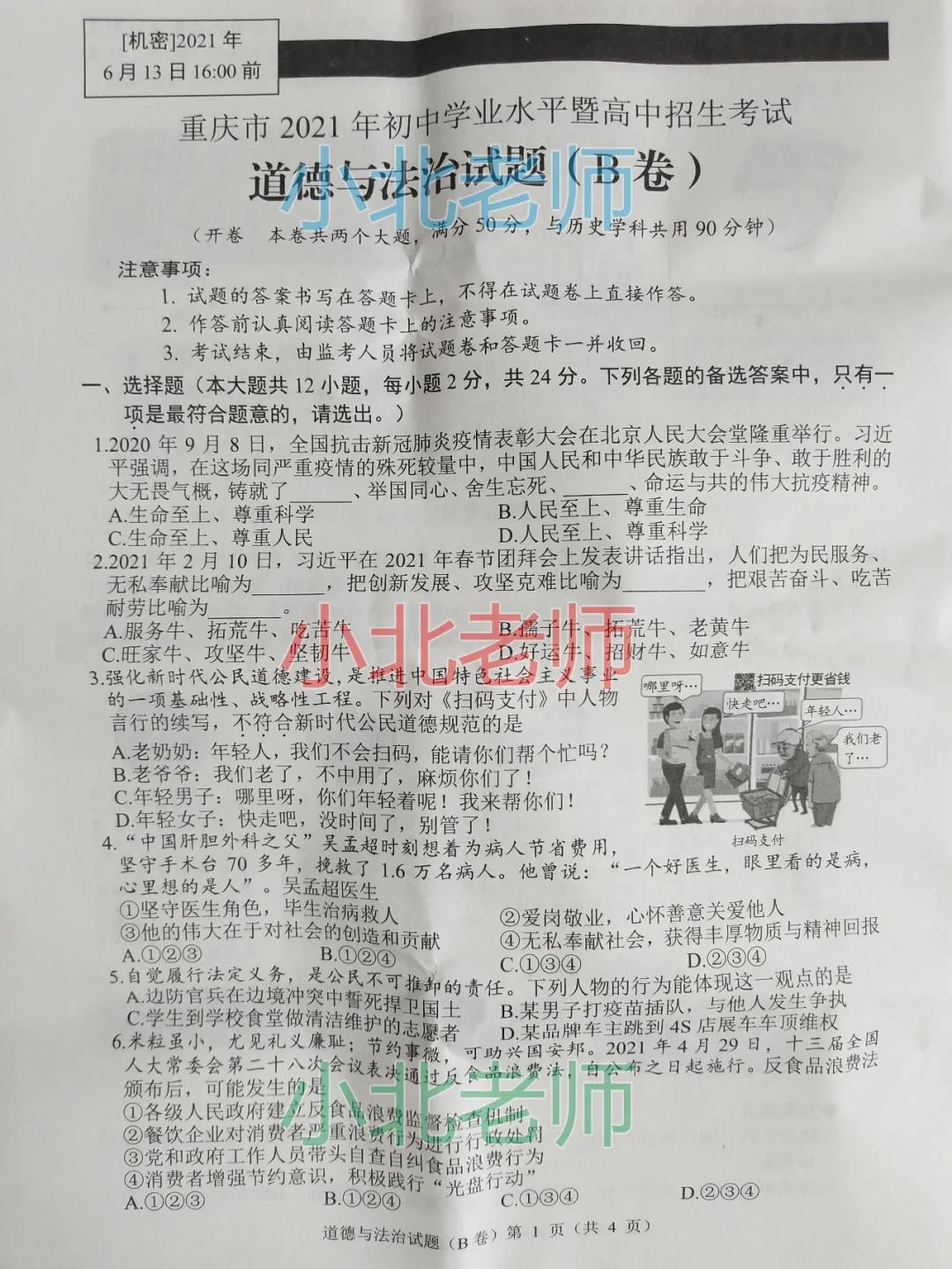 2021年重庆市毕业生学业考试道德与法治真题B卷