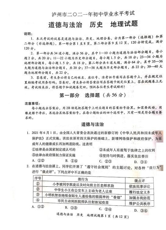 2021年四川泸州市初中学业水平考试道德与法治真题试卷