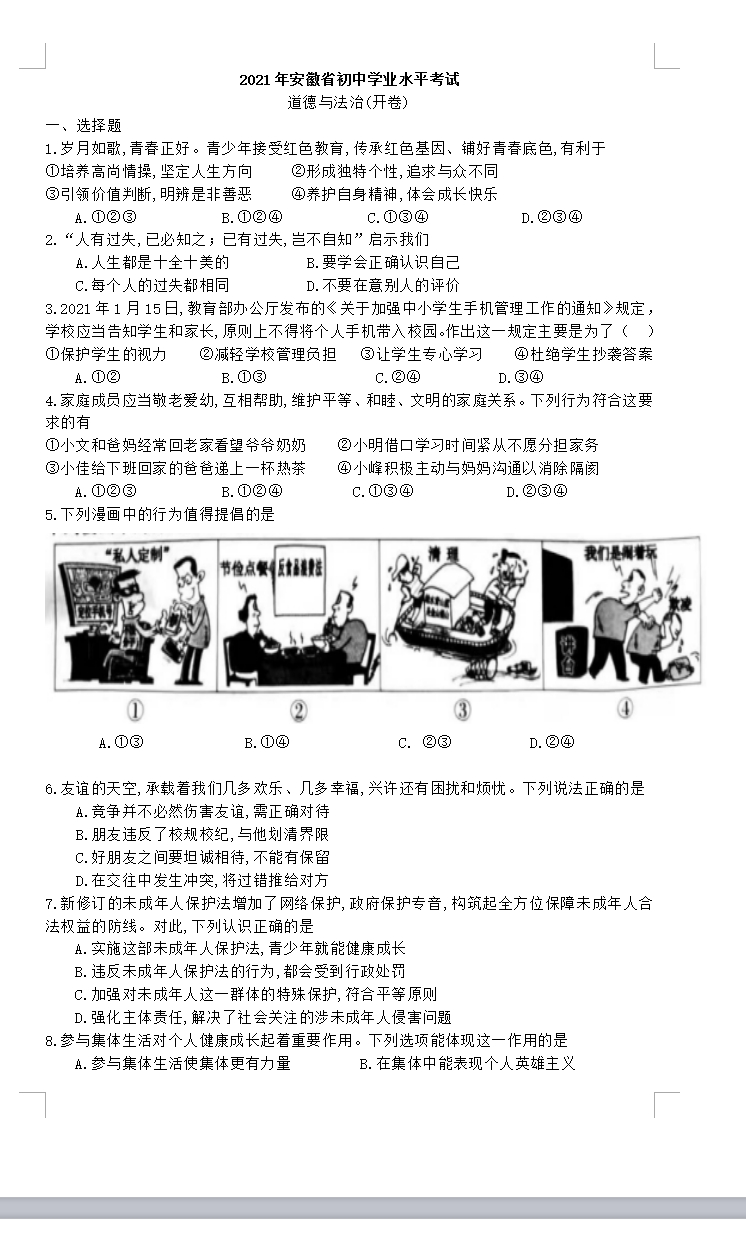 2021年安徽省初中学业水平考试道德与法治真题试卷