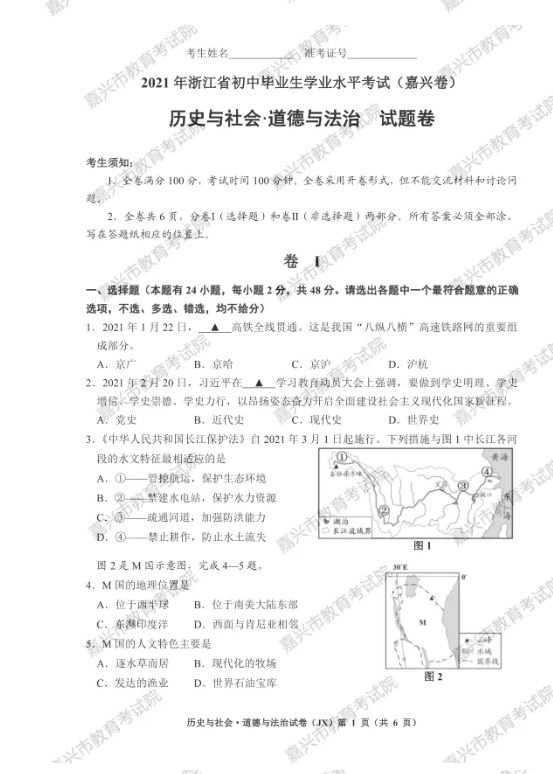 2021年浙江省嘉兴初中学业水平考试道德与法治真题试卷
