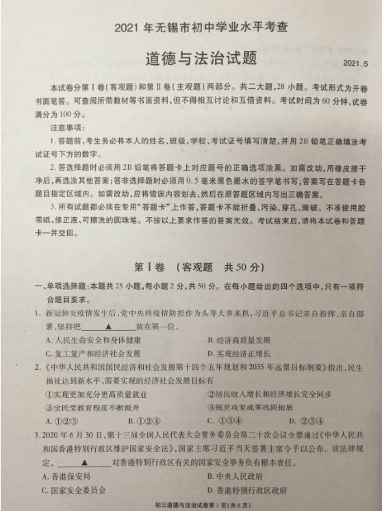 2021年江苏无锡初中学业水平考试道德与法治真题试卷
