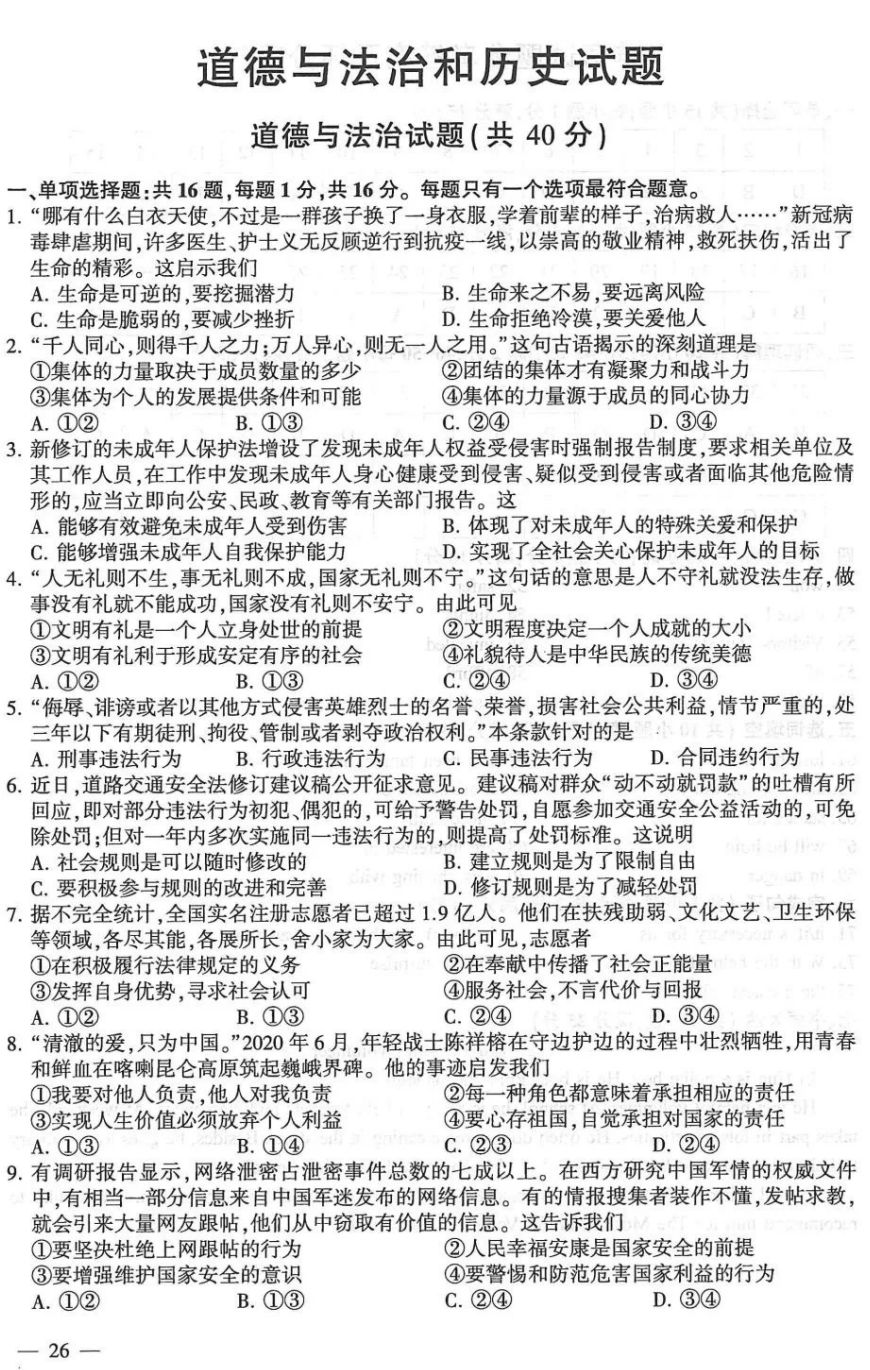 2021年江苏省连云港初中学业水平考试道德与法治真题试卷