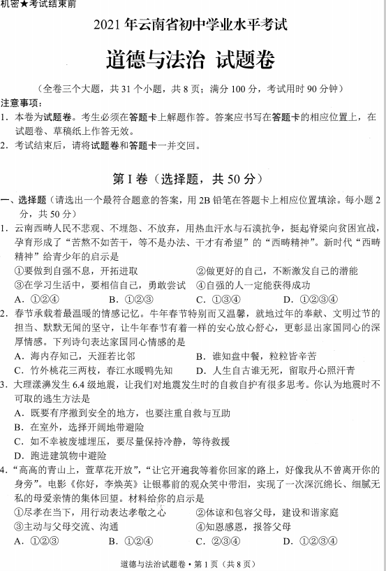 2021年云南省初中学业水平考试道德与法治真题试卷