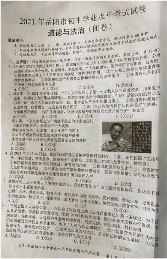 2021年湖南岳阳初中学业水平考试道德与法治真题试卷