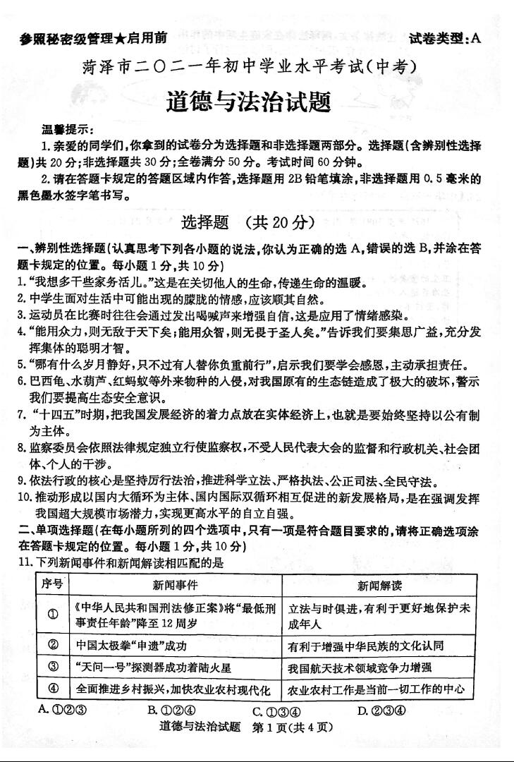 2021年山东菏泽初中学业水平考试道德与法治真题试卷