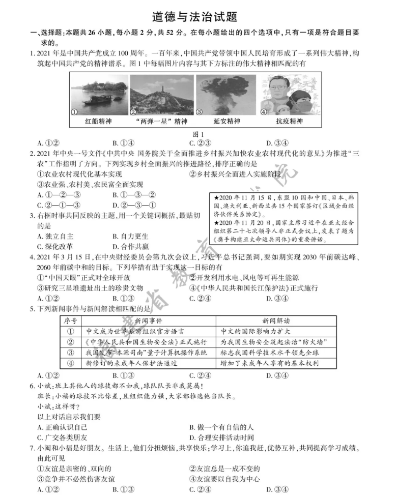 2021年福建省初中学业水平考试道德与法治真题试卷