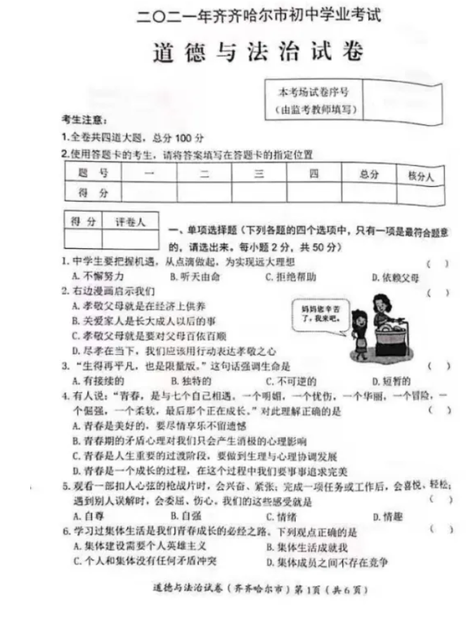 2021年黑龙江齐齐哈尔初中学业水平考试道德与法治真题试卷