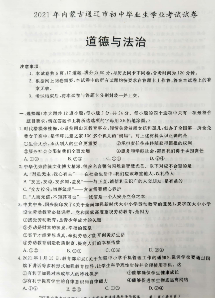 2021年内蒙古通辽市初中学业水平考试道德与法治真题试卷