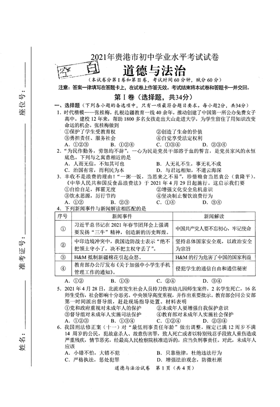 2021年广西贵港市初中学业水平考试道德与法治真题试卷