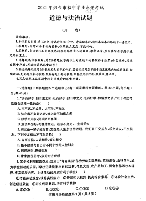 2021年山东烟台初中学业水平考试道德与法治真题试卷