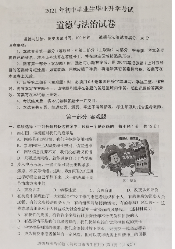 2021年辽宁营口初中学业水平考试道德与法治真题试卷