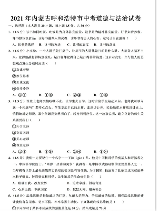 2021年内蒙古呼和浩特初中学业水平考试道德与法治真题试卷