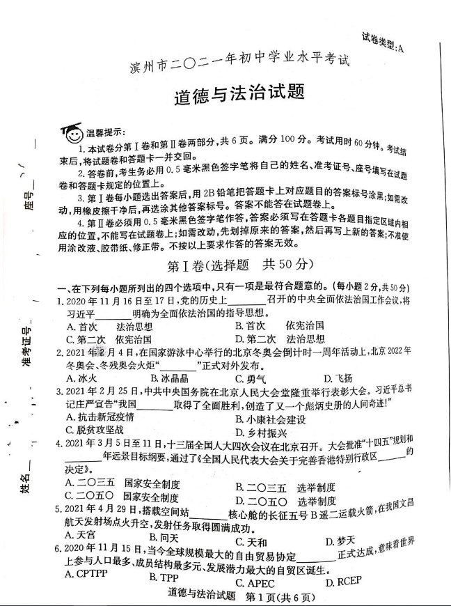 2021年山东滨州市初中学业水平考试道德与法治真题试卷