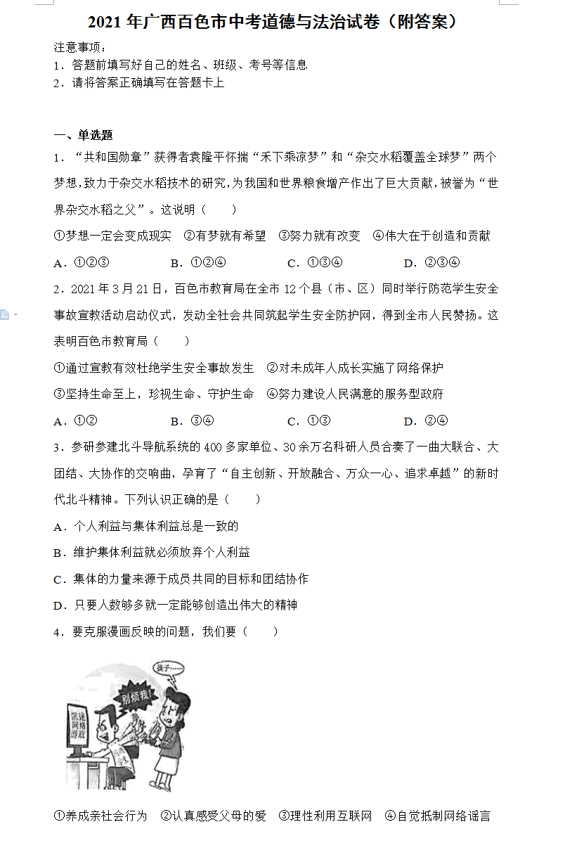 2021年广西百色市初中学业水平考试道德与法治真题试卷