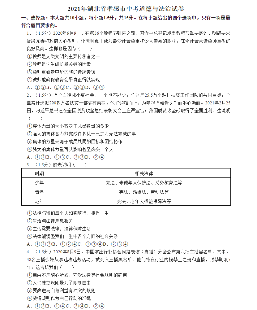 2021年湖北孝感市初中学业水平考试道德与法治真题试卷