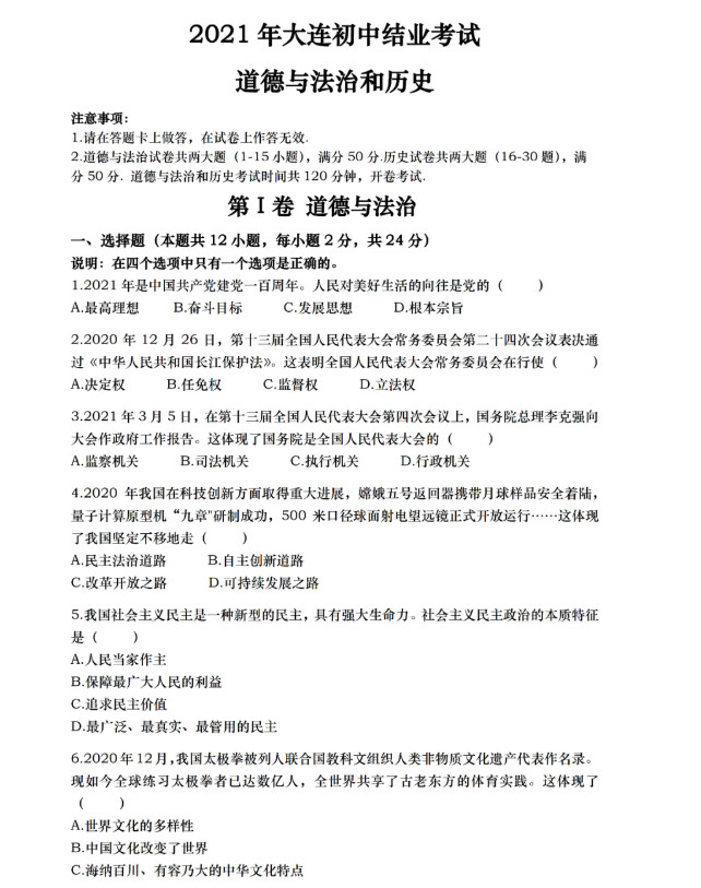 2021年辽宁大连市初中学业水平考试道德与法治真题试卷