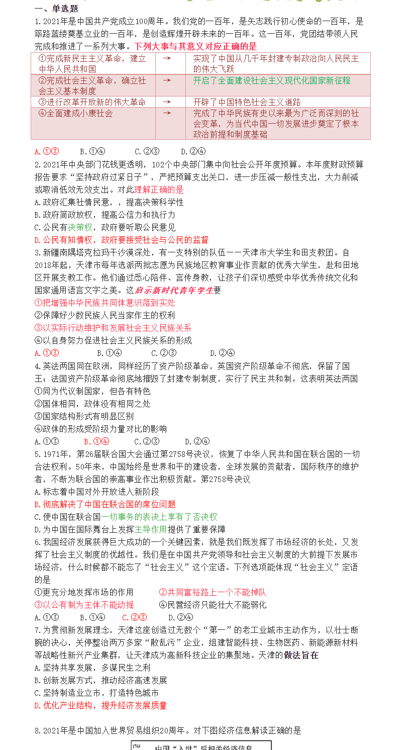 2021年天津市初中学业水平考试道德与法治真题试卷